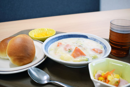 上階のサービス付き高齢者向け住宅カローレエベッサ千里丘のキッチンから届く日替わりランチ♪ 見た目もお味も大好評です。イベント食の時は5階のレストランで召し上がっていただくこともあります。